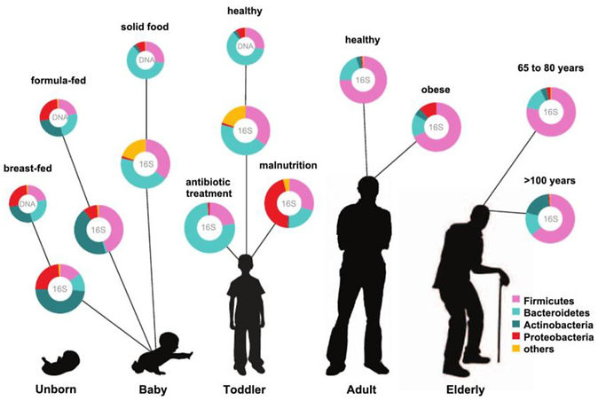 Key alterations in the gut microbial composition occur throughout the weaning period because the infant moves from consuming formula or breast milk to solid food In adolescence, microbial diversity and functional capacities develop toward an adult-like microbial profile, with each individual having a unique microbial community. No two people have the exact same microbial community—not even monozygotic twins. In adulthood, nutrition and antibiotics are the essential aspects that impact the composition of the gut microbiota across the human lifespan. Consequently, the description of the adult microbiota state as ‘stable’ is some-what imprecise, as the gut microbial community alters over time and can be restored after changes.